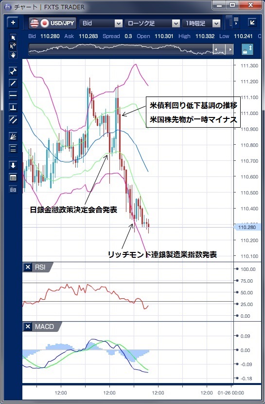 1月23日のドル/円相場は、東京朝方は110円台後半で推移していましたが、日銀金融政策決定会合で「日銀が予想物価上昇率の判断を上方修正した」との速報が流れると海外ファンド勢が反応し、一時的に円買いとなり110円半ばまで円高が進みました。 この下落でボリンジャーバンドを下抜けましたが、ヒゲにとどまり一過性の反応だったといえます。 その後、黒田総裁が会見で「出口戦略を検討する段階には至っていない」と発言したことでドルは反発し111円台を回復する動きとなりました。 しかし、欧州時間に入ると米債利回りが低下基調で推移し、米国株先物が一時マイナスに転じたこともあり、ドル売りが優勢となり、再び111円を割れる展開となり、さらにNY時間では1月のリッチモンド連銀製造業指数が 14と市場予想を下振れたことで110円25銭まで売り込まれました。 トランプ政権によるセーフガードの発令など、米中間選挙を控え、同政権が保護貿易主義に走るとの見方もドル売り要因となっているとの指摘もありました。 本日は、日本株も下落して始まる可能性が高く、110円割れが回避されるのかどうかが焦点となりそうです。 ※チャートは、ドル/円の1時間足ボリンジャーバンドRSIMACDを表示しています。