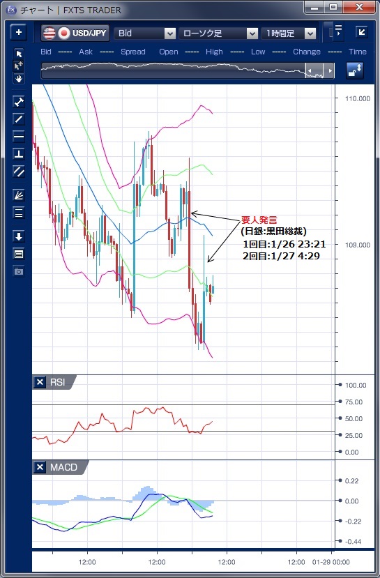 1月26日のドル/円相場は、東京時間は前日のトランプ大統領のドル高容認発言でドルが値を戻した流れを引き継ぎ109円台で底堅い始まりとなりました。 しかし、買い一巡後は、じりじりと値を下げ109円台前半での取引となりました。 欧州時間に入ると、ドルは下げ止まったものの、上値が抑えられる動きで109円台前半での取引が続きました。 NY時間に入ると、日銀の黒田総裁がダボス会議にて日本は2%のインフレ目標にようやく近い状況にあると述べたことが伝わり、マーケットでは早期の緩和策解除への思惑が浮上し円買いが加速、一時108円28銭の安値を付けました。 しかし、その後に日銀が声明を発表し、「黒田総裁はダボスでインフレ見通しを修正したわけではない」と確認したため、108円半ばまで値を戻してNYを引けています。 テクニカルで見ると、東京時間での戻しでボリンジャーバンドを上抜いた動きが騙しに終わっているものの、その後のバンド下抜けも一過性の動きであり、短期的に市場が混乱していることが示唆されています。 ただし、1月9日から始まったドル下落は続いており、先週末もドルは下値を切り下げていることから、ドル売り圧力は続いていると考えられ、昨年の安値107円30銭水準が意識される動きとなりそうです。 ※チャートは、ドル/円の1時間足ボリンジャーバンドRSIMACDを表示しています。