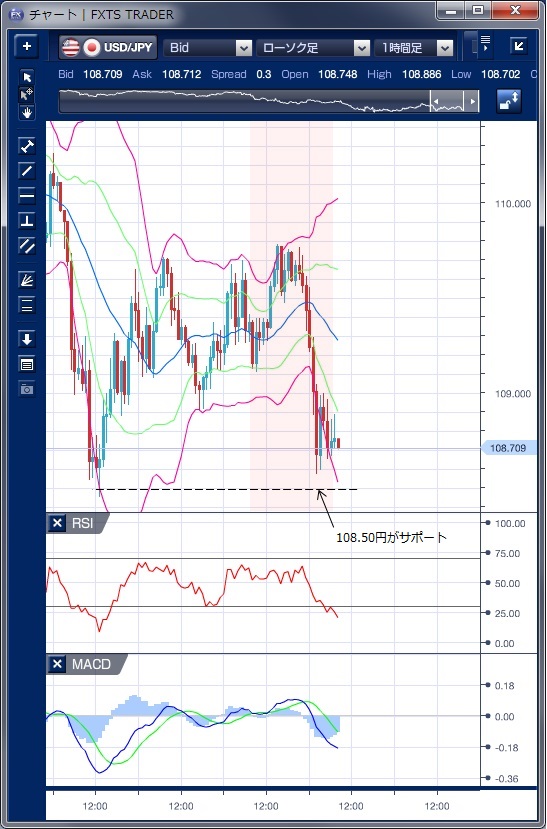 2月8日のドル/円相場は、東京時間から欧州序盤にかけては109円台でドルの底堅い動きが続きました。 反発した株価をにらみながら一時109円78銭の高値を付けています。 その後NY序盤までドルは高値圏での持合いとなっていましたが、MACDを見ると天井を付けて反転し売り転換の兆しが出ていることがわかります。 NY時間に入ると、米株式市場が大幅続落し、10年債利回りが再び4年ぶり高水準を試す中、リスク回避の動きが優勢となり安全資産とされる円やスイスフランを買う動きが強まり、ドル/円は再び109円を割り込む動きとなり、108円58銭の安値を付けています。 NY終盤にかけては、ショートカバーでドルは持ち直したものの、109円水準は上値が重くなっており、108円70銭水準で引けています。 米国株式の下落がドル安要因となる一方、米長期金利の上昇がドルを支えています。 本日は、日本株も下落して始まることが予想され、その動きの中で108円半ばのサポートが維持されるかが注目されます。 また、下落が続き108円を割れてくるようであれば、昨年安値である107円30銭水準が視野に入ってくるでしょう。 ※チャートは、ドル/円の1時間足ボリンジャーバンドRSIMACDを表示しています。