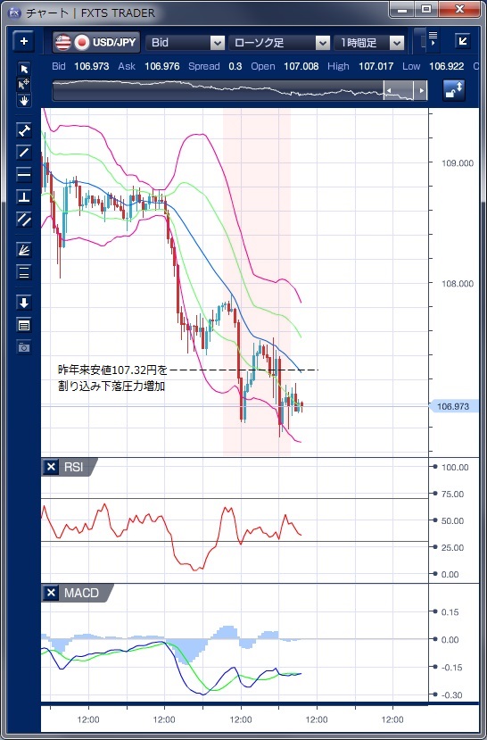 2月14日のドル/円相場は、東京時間朝方は前日の大幅下げの反動もありショートカバーが優勢で一時107円91銭まで値を戻しました。 しかし、108円水準からは既に上値が重く反落、日経平均のマイナス転換とともにドル売り・円買いが優勢となり、下値めどとみられていた昨年安値107円32銭を割り込むと、ストップロスを巻き込みながら下落スピードが加速し、節目の107円も下回り、午後1時過ぎにかけて106円84銭まで下落しました。 この下落で、ボリンジャーバンドを下抜けたものの、バンドウォークにはつながらず、昨日とは違い下落に大きな力がないことが示唆されています。 欧州勢が参入してくると、ややドルの買い戻しが優勢となり107円台を回復、その後NY時間に入ると、1月の米消費者物価指数(CPI)が前年比 2.1%、コアCPIが同 1.8%と、いずれも市場予想を上回り、前月と同じ伸びとなったこと、同時に発表された同月の米小売売上高が前月比0.3%減と市場予想に反しマイナスとなったことなどを受け、米国債利回りが急上昇したことでドルも一段と上昇、一時107円54銭まで値を戻しました。 しかし、NY中盤以降はインフレや金利上昇が成長の脅威になるとの懸念が浮上し、ドルは再度反落に転じ107円水準でNYを引けています。 マーケットが意識してきた下値めどを次々と下抜けてきており、しばらくは下値を探る動きが続きそうです。 ※チャートは、ドル/円の1時間足ボリンジャーバンドRSIMACDを表示しています。
