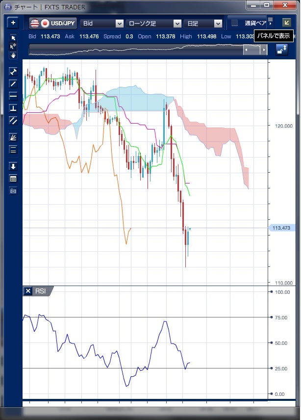 チャートは、ドル/円の日足一目均衡表RSIを表示しています。 先週のドル/円相場は、週初に重要な下値抵抗であった116円水準を下抜けると、その後はドル売り圧力が強まり、ドルは下げ続ける動きとなりました。 イエレン米連邦準備制度理事会(FRB)議長が10日に開かれた議会証言で金融環境は引き締まっていると指摘し、米利上げペースが大幅に鈍化するとの観測が広がったことや、日本株の大幅下落が嫌気され、11日には一時110円99銭まで下落し、2014年10月31日以来となる111円割れを記録しました。 ただし週末には、黒田日銀総裁が首相官邸に出向いて安倍首相と最近の市場動向について意見交換したことから、早期追加緩和への思惑が広がったことやダドリーNY連銀総裁が「米国経済は依然強い」と発言したこと、1月の米小売売上高が予想を上回ったことを好感してドルは113円台を回復して週を越えています。 テクニカルでは、強い下値抵抗であった116円水準を抜けたことで下値不安が高まっており、各国金融市場の動揺が続くなか不透明感が高い相場となっています。 RSIは既に売られ過ぎ水準まで来ているものの、もう一段の下値リスクは残っている様に見えます。 ただし、遅行スパンとローソク足に関係を見ると、今週は相場が横這いとなる可能性も高く、目先は現状水準で持ち合うのかも知れません。 リスク回避による急激な円高は一服したと思われるものの、米3月利上げ観測は後退しており、リスク選好的なドル買い・円売りが大きく広がる状況ではなく、株式市場や原油価格を睨みながらの展開が続くものと思われます。