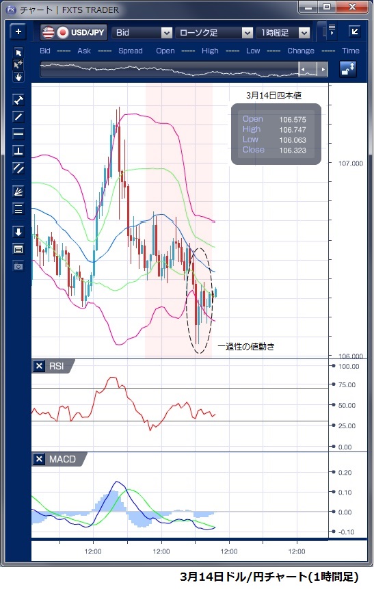 3月14日のドル/円相場は、東京時間から欧州時間にかけて106円台半ばで方向感のない動きが続きました。 日経平均が寄り付きからマイナス圏で推移し、ドルも上値の重さが意識されたものの、売り込んでいく材料もなく模様眺めの動きとなりました。 NY時間に入ると、米2月小売売上高(※1)が予想外のマイナスになったためドル売りが優勢となったことに加え、トランプ政権が中国からの輸入品のうち最大600億ドルに相当する製品に関税を課すことを計画していると伝わったことで米中貿易戦争への警戒感が広がり、一時106円07銭の安値を付けました。 この下落でボリンジャーバンドを下抜けたものの、すぐに反発しており一過性の下落にとどまっています。 また、価格の下げにもかかわらずRSIは下値を切り上げており、ドル売りに強い勢いがなかったことが窺えます。 ※米小売売上高とは 米小売売上高とは、米国の百貨店やスーパーなどの小売・サービス業の月間売上高について毎月公表される経済指標である。個人消費を示す指標とされ、先月の数値と比較して増えていれば景気拡大、減っていれば景気後退とされる。 ※チャートは、ドル/円の1時間足ボリンジャーバンドRSIMACDを表示しています。