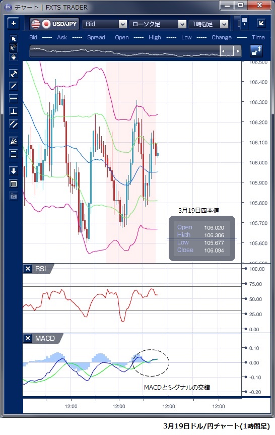 3月19日のドル/円相場は、東京時間朝方は106円台で始まったものの、安倍政権の支持率の低下でアベノミクス減速懸念 による円高リスクが高まってきたとの見方も強まり、じりじりと軟化し、105円68銭まで下落しました。 日経平均の下落も円高につながったとの指摘もあります。 その後欧州時間に入ると、ドルの買い戻しが優勢となり106円台を回復する展開となりました。 この上昇で、ボリンジャーバンドを上抜けしましたが、ヒゲだけの突破に留まっており、強い上昇力は感じられない形となっています。 NY時間に入ると、米債利回りが米国株の下げを背景に低下基調となり、それに伴いドルも105円78銭まで下落しました。 しかし、取引後半に入り、米国株が下げ止まり、米債利回りは反発するとドルも反転し106円台を回復、106円10銭水準でNYを引けています。 N Y時間の上下動では、MACDがゼロ水準でシグナルと交錯しており、方向感がないことを示しています。 ドル/円は105円半ばから106円半ばの狭いレンジ内での動きが続いており、22日未明の米FOMC (※1)結果発表までは膠着した動きが続きそうです。 ※1.FOMC(米国連邦公開市場委員会)とは FOMCとは、FRB(米連邦準備理事会)が開く会合で、米国の金融政策を決定する。昨年12月の会合では利上げが行われ、今回の会合(22日未明発表)でも利上げが確実視されている。 ※チャートは、ドル/円の1時間足ボリンジャーバンドRSIMACDを表示しています。