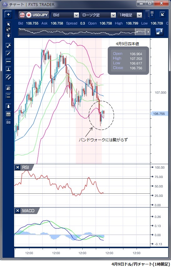 4月9日のドル/円相場は、東京時間から欧州時間にかけてドルは底堅く推移し、朝方の106円80銭水準から107円20銭の高値まで上昇しました。 ただし、107円台ではドルの上値も重く、新規材料なしに一段の高値を追う動きには繋がりませんでした。 NY時間に入ると、前週末の米政府の高官発言などから、米中貿易摩擦への過度の警戒感が後退したとの見方からドル買いが優勢となる局面もありましたが、取引終盤では米連邦捜査局(FBI)がトランプ大統領の顧問弁護士の事務所を強制捜査したとの報道を受けて米国株が急速に伸び悩んだことから、リスク・オフの円買いが強まり106円62銭まで下落しました。 この下落で、ボリンジャーバンドを下抜けたもののすぐに反発しておりバンドウィークにはつながりませんでした。 また、RSIも東京朝方の水準まで下落しておらず、ドルの下値も底堅いことが示唆されています。 本日も、新たな材料が出てこない限り106円台を中心とした方向感のない動きが続きそうです。 ※チャートは、ドル/円の1時間足ボリンジャーバンドRSIMACDを表示しています。