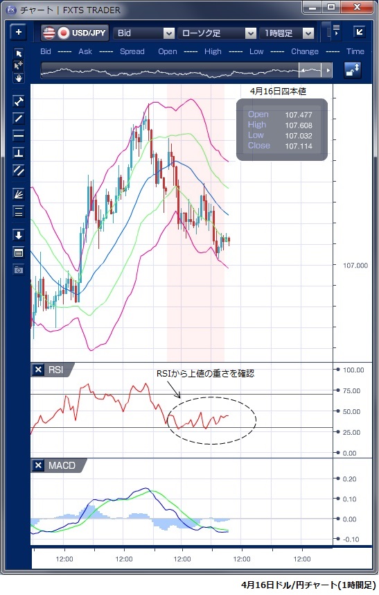4月16日のドル/円相場は、前週末の英米仏軍のシリア攻撃でも市場に大きなインパクトは見られず、107円前半から半ばの狭いレンジ内を上下する展開となりました。 しかし、日米首脳会談を控えてドルを買い進む状況にはなく、ドルの上値の重い印象の相場となりました。 海外時間に入っても、同様の動きが続き107円前半での狭い取引となりました。 3月の米小売売上高は前月比で4カ月ぶりに増加したものの、市場への影響は限られたものとなっています。 その後、トランプ米大統領がロシアや中国を「通貨切り下げをしている」と非難したことなどから、貿易摩擦懸念が再燃し、107円014銭の安値を付けました。 日米首脳会談で米国が円安をけん制するとの見方も残っており、ドルの上値を抑える要因となっていると指摘されます。 テクニカルでは、昨日一貫してRSIが50を下回って推移しており、ドルの上値の重いことを示唆していました。 ※チャートは、ドル/円の1時間足ボリンジャーバンドRSIMACDを表示しています。