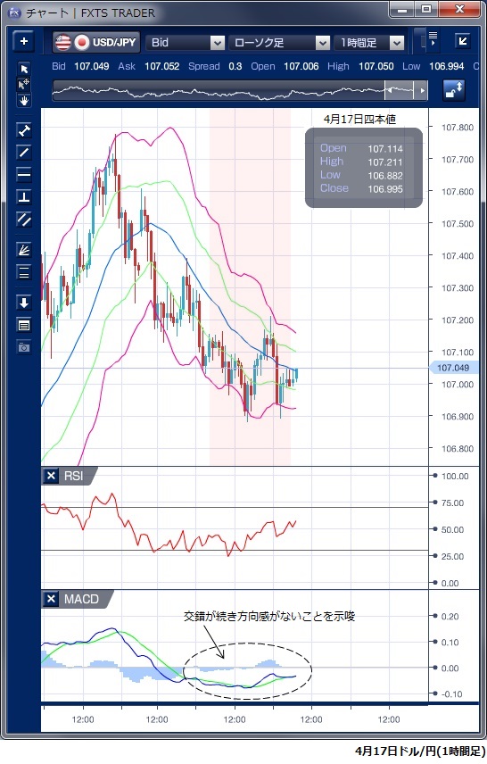 4月17日のドル/円相場は、107円を挟んで方向感のない小動きが続きました。 東京時間は、107円台で始まったものの、手控えムードのなか軟調な推移で、欧州スタート時には106円台まで下押ししました。 NY時間では、朝方発表の米経済指標で、3月の住宅着工件数が年率換算で前月比1.9%増の131万9000戸と市場予想を上回ったほか、3月の鉱工業生産は0.5%増加し、これも市場予想の0.4%を上回ったことを好感し、ドルは107円21銭の高値を付けました。 しかし、日米首脳会談に対する警戒感もあり、ドルは伸び悩み、再び107円ちょうど近辺の動きとなってNYを引けています。 テクニカルで見ても、幅を縮小しているボリンジャーバンドが上下の抵抗として機能しており、一方向への動きは見えない状況です。 また、MACDを見てもシグナルとの交錯が続いており、方向感を失っていることがわかります。 ※チャートは、ドル/円の1時間足ボリンジャーバンドRSIMACDを表示しています。
