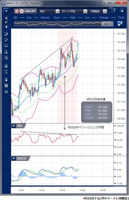 4月20日のドル/円相場は、東京時間では商業決済が集中しやすい五・十日ということもあり、仲値の午前10時にかけて実需筋のドル買い/円売りが出て107円73銭まで上昇しました。 その後は利食いのドル売りに押され値を戻しましたが、下値は107円半ばまでで底堅く、すぐに反発、NY時間では2か月ぶりの高値である107円86銭まで上昇しました。 目新しい材料はなかったものの10年物の米国債利回りが一時2.96%と2014年1月以来の水準に上昇したことがドル買いにつながったと指摘されます。 ドルの下値はすでに107円半ばが抵抗となってきており、108円抜けを試せるかどうかが注目されます。 ただしテクニカルを見ると、先週末は価格が高値を更新しているものの、RSIは頭打ちとなってしまっており、短期的な反落の可能性が示唆されています。 ※チャートは、ドル/円の1時間足ボリンジャーバンドRSIMACDを表示しています。