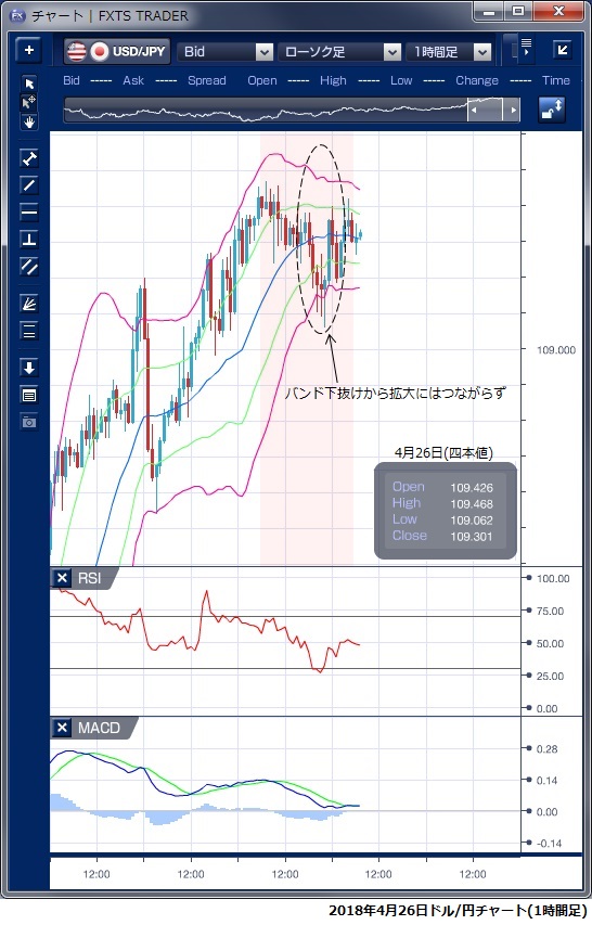 4月26日のドル/円相場の動きをテクニカルで検証してみます。 4月26日のドル/円相場は、東京朝方はドルの上値を試しに行き、一昨日の高値を更新し109円47銭まで上昇しました。 その後は、ポジション調整の動きが中心で109円台前半での方向感のない動きが続きました。 欧州時間に入り、欧州中央銀行(ECB)理事会で現状維持が決められました。 その後のドラギECB総裁の記者会見で、ユーロ圏内の景気拡大について「しっかりとした幅広い成長が期待される」とし、緩やかながら堅調な経済成長は継続するとの見方を示したことを受けてユーロ買いとなりましたが、ドル/円への影響はありませんでした。 NY時間に入ると、10年物の米国債利回りが3日ぶりに節目の3%を下回り、ドルも109円前半へ軟化しましたが、米週次新規失業保険申請件数が48年ぶり低水準を記録し米国の労働市場ひっ迫が確認されたほか、3月耐久財受注速報値が予想を上回ったこともあり、終盤にかけては持ち直し109円30銭水準で引けています。 このドル安の流れでボリンジャーバンドを下抜けたものの、バンドの拡大は起きず、一過性の動きとなっていることがわかります。 ※チャートは、ドル/円の1時間足ボリンジャーバンドRSIMACDを表示しています。