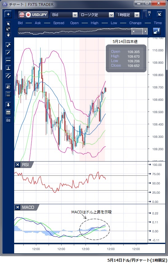 5月14日のドル/円相場は、東京朝方に109円20銭の安値を付けましたが、その後は徐々に切り上がる動きとなりました。 MACDを見ると、朝方から一貫してドル買いの形となっており、その後のドル上昇を示唆するものとなっています。 その後、欧州勢が参入してくると、109円半ばを回復、109円60銭まで上昇しました。 この上昇で、弱いバンドウォークが形成されていることがわかります。 NY時間では、一時109円42銭まで緩む局面もありましたが、米国債10年債利回りが再び3%を目指す展開となったためドル買いが再燃し109円67銭の高値を付け、ほぼ高値圏でNYを引けています。 貿易摩擦問題を巡る米中協議の再開を明日に控えて、トランプ大統領が中国の通信企業との取引再開に向けて譲歩する姿勢を示し、協議進展への楽観的な見方が強まっていることもドルの下支えとなったとの指摘もあります。 ※チャートは、ドル/円の1時間足ボリンジャーバンドRSIMACDを表示しています。