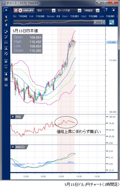 5月15日のドル/円相場は、東京午前中は109円70銭水準での小動きが続きましたが、午後になるとドル買いが優勢となり110円を試す動きが強まりました。 しかし、110円水準の上値抵抗は強く欧州序盤までは抜けることができませんでした。 NY時間序盤では、ドル買い圧力が強まりました。 朝方発表された4月の米小売売上高は前月比0.3%増と市場予想と一致し、3月分は上方修正されました。さらに、5月のニューヨーク連銀製造業景況指数も市場予想を大幅に上回って上昇し、これらの発表を受けドルは一時110円45銭の高値を付けています。 また、長期金利の指標となる米10年物国債の利回りが6年10カ月ぶりの高さである3.09%まで上昇したこともドル買いに拍車をかけました。 この上昇でボリンジャーバンドを上抜けしバンドウォークが発生していますが、既にバンドが開いていたことでバンドウォークの発生時間は短期にとどまってしまったことが確認できます。 ダブルトップが意識されていた110円水準をクリアーに上抜けてきたことで、もう一段の上値余地が広がっています。 ただし、価格の上昇にかかわらずRSIが高値圏に張り付きつつもやや垂れてきていることで、短期的な調整のリスクには留意が必要でしょう。 ※チャートは、ドル/円の1時間足ボリンジャーバンドRSIMACDを表示しています。
