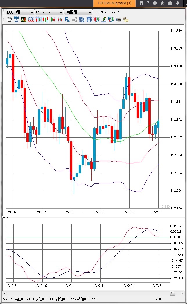 チャートは、ドル/円の1時間足ボリンジャーバンドMACDを表示しています。 昨日のドル/円相場は、東京朝方からドルのショートカバーの買いが先行し、じりじりとドルが値を戻す動きとなりました。 日経平均の上げ幅拡大に反応する形で、仲値公示を挟んで113円代を回復するまで買い進まれました。 その後は、日経平均の上げ縮小につられ112円80銭付近まで押し戻されましたが、112円半ばでは本邦勢の買い意欲も強く、大幅な下押しは回避され、112円後半での小動きが続いて方向感は出ませんでした。 海外時間に入ると、米国の1月シカゴ連銀全米活動指数が予想外のプラスに改善したことや原油価格の上昇を好感し、リスク回避ムードが後退し、円売り・ドル買いの動きが一時優勢となり113円28銭まで上昇しました。 この上昇でボリンジャーバンドを上抜けしたものの、一過性の動きに終わっており、明確な方向性は出ませんでした。 その後は2月製造業PMI速報値が予想外に悪化したためドルは伸び悩み112円台に押し戻されてNYを引けています。 MACDを見ると、東京朝方には既に買い転換し手織り、終日の緩やかなドル上昇が示唆されていたことがわかりますが、NYの引けにかけては再び売り転換しており、本日も113円台では上値の重い動きが続きそうです。