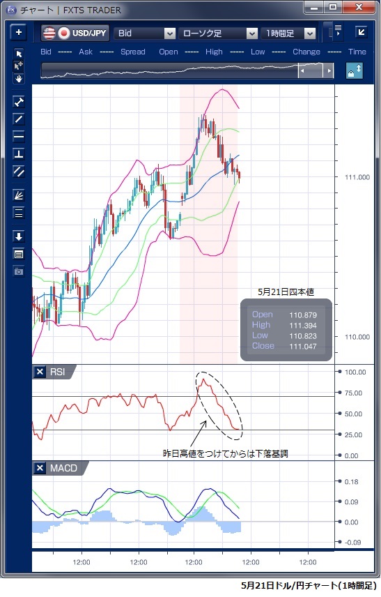 5月21日のドル/円相場は、週明け110円後半でスタートした後、ドルは堅調な足取りで111円台を回復する動きとなりました。 米中両政府が19日に発表した通商協議の共同声明で、中国が米国の製品やサービスの購入を「大幅に」増やすと合意したしたこと、またムニューシン米財務長官が米中貿易戦争をいったん「保留する」と述べたことなどがドル上昇の背景にあると指摘されます。 欧州時間に入ってもドルの底堅い動きは続き、一 時111円40銭をつけて、1月18日以来4カ月ぶり高値を更新しました。 この上昇で、ボリンジャーバンドを上抜け、小さなバンドウィークが形成されています。 しかし、111円半ばからは利食い売りもあり、徐々に反落する展開で、NY時間に入ると4月米シカゴ連銀全米活動指数が予想を下回り、米国債利回りが伸び悩んだことから、ドルは111円台前半でもみ合う展開となりました。 RSIをみると、111円40銭の高値を付けた後は、一貫して下落基調となっており、NY時間はドル売り圧力が強かったことが示唆されています。 米10年債利回りは3%台を維持しており、米国株式も大幅高でドル売りの要因がない中、ドルの上昇一服の動きとなっており、利食い圧力が強かったことが示唆されます。 大きな押し目は期待しにくいものの、短期的には時間調整の可能性を考えておく必要があるかもしれません。 ※チャートは、ドル/円の1時間足ボリンジャーバンドRSIMACDを表示しています。