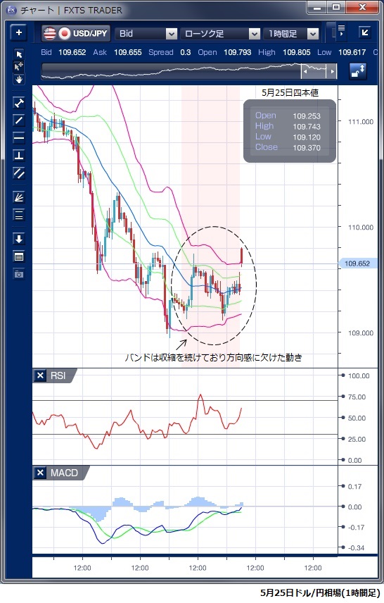 先週末(5月25日)のドル/円相場は、109円台で方向感のない動きが続きました。 前日の米朝首脳会談の中止を受けたドル安の影響が残り109円前半で始まったものの、実需の売買が集中する五・十日だったことや、週明けの本日が米英で休場となることなどから、仲値前後の実需のドル買いが優勢となり109円74銭まで上昇しました。 また、北朝鮮政府が、米政権が米朝首脳会談を中止したことに関して「いつでも向き合って問題を解決する用意がある」との談話を公表し、トランプ米大統領も今後の首脳会談について当初の予定通りの6月12日に行う可能性もあると記者団に述べたことなどもドルの下支え要因となったようです。 しかし、111円台で目先天井を付けた可能性への警戒感もあり、ドルの戻りは限られたものとなっています。 テクニカルで見ると、ボリンジャーバンドは収縮を続けており、一方向への大きな動きは期待しにくい形状となっています。 週明けの本日は、米朝首脳会談が予定通り開催される可能性が高まったことを受け、東京朝方には109円80銭水準まで値を上げて始まっています。 この上昇でボリンジャーバンドを上抜けており、バンドウォークにつながるかどうかが注目されます。 ただし、本日は米英が休場であり、積極的な取引は見送られる可能性もありそうです。 ※チャートは、ドル/円の1時間足ボリンジャーバンドRSIMACDを表示しています。