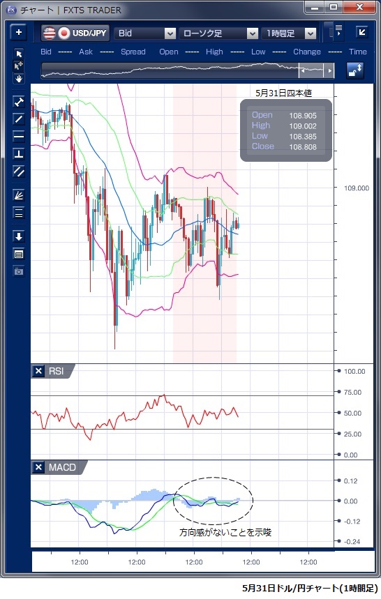 5月31日のドル/円相場は、108円台後半で方向感のない動きが続きました。 イタリアの政局を巡る過度なリスク回避の動きは後退し、円は売り戻されたが、その動きは早くも一服となり、動きにくい状況が続いています。 欧州時間に109円台を付けたものの、滞空時間は短く、その後NY時間序盤には米国がEUやカナダ、メキシコから輸入する鉄鋼とアルミニウムへの関税を発動すると発表し、対象国が相次いで米国に報復関税を課すなど対抗する意向を示し、貿易摩擦の激化への懸念が強まったことからドルが売られ、一時108円39銭まで下落しました。 ただ、本日の5月米雇用統計の内容を見極めたいとのムードが根強く、積極的にドルを売る動きは限られ、米長期金利が上昇に転じるとドルも値を戻し108円後半でNYを引けています。 NY時間のドル下落時に、ボリンジャーバンドを下抜けたもののバンドの拡大は伴わずバンドウォークには繋がりませんでした。 また、MACDとシグナルがゼロ水準で交錯しており、明確な方向感がないことが示唆されています。 ※チャートは、ドル/円の1時間足ボリンジャーバンドRSIMACDを表示しています。