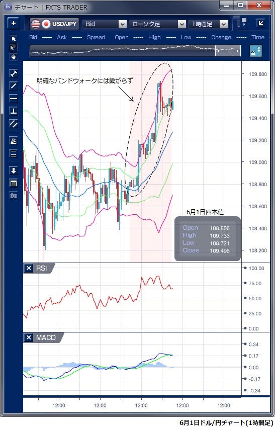 先週末(6月1日)のドル/円相場は、東京市場では米雇用統計を控えポジション調整の動きからドルがやや上昇する流れとなりました。 朝方108円後半でスタートし、その後正午過ぎにはストップロスを巻き込みながら109円台を突破し、109円25銭の高値を付けました。 この上昇でボリンジャーバンドを上抜いていますが、バンドウォークにつながる動きにはなりませんでした。 欧州時間は、見送りムードが強く、109円前半で小動きが続きました。 NY時間に入り、注目の米雇用統計で非農業部門雇用者数が前月比22万3000人増え、市場予想の19万人増を上回り、失業率も前月比で0.1ポイント改善して3.8%と約18年ぶりの水準に低下したことを受けて、ドル買いが優勢となり一時109円73銭まで上昇しました。 この上昇で、再度ボリンジャーバンドを上抜けましたが、この時も明確なバンドウォークにはつながりませんでした。 先週末はドルの買い戻しが優勢となったものの、市場では貿易摩擦の激化への警戒感がくすぶっており、ドルの上値を抑える一因になっているとの指摘もあり、110円が天井となるのか、見極めが必要といえそうです。 ※チャートは、ドル/円の1時間足ボリンジャーバンドRSIMACDを表示しています。