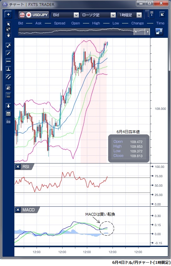 6月4日のドル/円相場は、ドルが109円後半で底堅い動きを続けました。 先週発表された米経済指標の内容が良かったことや、日経平均が300円超の上昇となるなどを支援材料にドルはじり高となりました。 ただし、110円の壁は厚く、突破できずに109円後半での動きが続きました。 海外時間でも欧州の政治リスクが後退する中、米中貿易摩擦の激化懸念がドルの上値を抑える動きとなりました。 NY時間序盤に109円37銭まで下押す局面もありましたが、引けにかけては値を戻し109円80銭水準でNYを引けています。 テクニカルで見ると、NY終盤にMACDが買い転換しており、本日もドルの上昇が期待されますが、110円を突破できるかが注目されます。 ※チャートは、ドル/円の1時間足ボリンジャーバンドRSIMACDを表示しています。