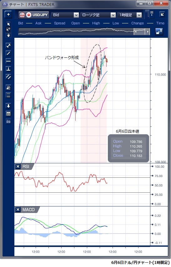6月6日のドル/円相場は、東京時間は109円後半での動きが続きました。 今週末に主要7カ国(G7)首脳会議、来週に米朝首脳会談、米連邦公開市場委員会(FOMC)、欧州中央銀行(ECB)理事会と多くのイベントを控え、様子見モードが支配的で、東京7時から15時までの値幅はわずか20銭弱にとどまりました。 その後欧州時間に入ると、ECBのプラート専務理事が、14日の次回理事会で「資産購入を徐々に減らしていくことが妥当か議論する」と述べたのを受け、ECBが金融政策の正常化に向けて動き出すとの観測からユーロ買いが強まり、ユーロ/円が上昇、これにつられてドル/円も上昇し、一時110円23銭の高値を付けました。 この上昇では、ボリンジャーバンドの上抜けと、軽いバンドウォークの形成が確認できます。 NY時間に入ると、序盤に発表された1~3月期の非農業部門の米労働生産性指数の改定値が、前月発表の速報値から下方修正され、市場予想も下回ったためドル売りが強まり、一時109円89銭まで下落しました。 しかし、その後は再びECBの金融政策正常化への思惑からのユーロ/円の買いが継続、ドル/円も上昇に転じ、米国株の大幅上昇も支援材料となり、110円27銭の高値を付けています。 ドルは110円台を回復してきましたが、200日移動平均の水準で止まっており、これを大きく上抜けるかが注目されます。 ※チャートは、ドル/円の1時間足ボリンジャーバンドRSIMACDを表示しています。