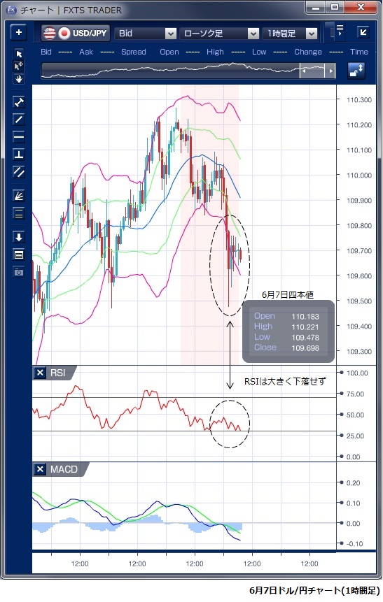 6月7日のドル/円相場は、東京から欧州時間にかけて110円を挟んで方向感のない動きが続きました。 日米首脳会談や週末のG7サミット、来週の米朝首脳会談など政治ベントを控えており、様子見ムードの強い動きといえます。 NY時間に入ると、米国債利回りが急速に下げたことでドル円も売り強まり、一時109円48銭まで下落しました。 南ア・ランドやメキシコペソ、ブラジルレアルなど新興国通貨の下げが加速したこともリスク回避の雰囲気を強めたことが要因との指摘もあります。 この下落で、ボリンジャーバンドを下抜けましたが、RSIの大きな下落はなく、一過性の動きである可能性が示唆されています。 ただし、110円台前半の200日移動平均水準で上値が止められたことで、110円台での天井感も形成されつつありドルの上値の重い動きが続きそうです。 明日からカナダで開催されるG7サミットに関して米国の関税措置に各国から非難が集まっており、何らかの解決策が出る可能性は低いと見られていることもドルを圧迫する要因とみられています。 ※チャートは、ドル/円の1時間足ボリンジャーバンドRSIMACDを表示しています。
