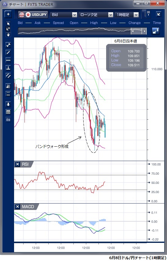 先週末(6月8日)のドル/円相場は、週末に主要7カ国(G7)首脳会議が行われるほか 、今週には米朝首脳会談、欧州中央銀行(ECB)理事会、米連邦公開市場委員会(FOMC)など重要イベントが相次ぎ、身動きがとりづらい状況が続きました。 東京時間では、値幅は約30銭程度で模様眺めの動きとなりました。 しかし、欧州時間に入ると欧州株安やG7首脳会議を巡る不透明感からリスクオフの円買いが優勢となり一時109円20銭まで下落しました。 この下落で、ボリンジャーバンドの下抜けと小さなバンドウォークの形成が確認できます。 NY時間に入ると米国株高を受け、市場心理も改善しドルの買い戻しが優勢となり109円半ばを回復しました。 その後は、109円前半での小動きが続き、109円50銭水準で週を越えています。 今週は、重要イベントが続きますが、特にFOMCは注目で政策金利の引き上げは確実視されているなか、欧州政治リスクの影響に関する言及が注目されます。 また、利上げ加速の期待が低下すれば、ドル売りがやや強まる可能性もありそうです。 ※チャートは、ドル/円の1時間足ボリンジャーバンドRSIMACDを表示しています。