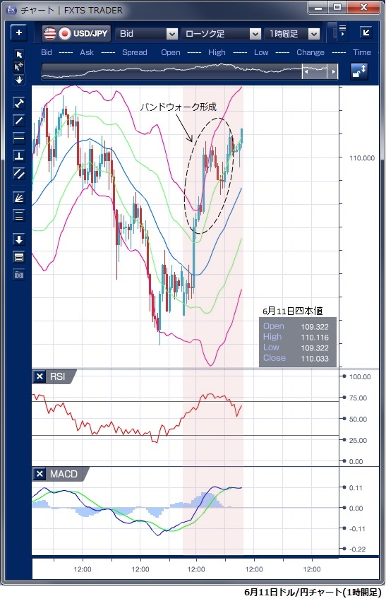 6月11日のドル/円相場は、109円前半でスタートした後、じりじりと押し上げられる動きとなりました。 東京仲値では、本邦輸入企業からの円売り・ドル買いがまとまって持ち込まれたとの指摘もあります。 東京昼からは一段と上昇し、欧州時間に入ると110円台を回復する動きとなりました。 本日の米朝首脳会談を前に、米朝関係の進展期待からリスクオンの流れとなったとみられます。 このドルの上昇で、ボリンジャーバンドを上抜けバンドウォークが発生、一時110円06銭の高値を付けました。 NY時間に入ると、110円を挟んでの動きとなりましたが、米朝首脳会談への期待が続き110円12銭の高値を付け、110円台でNYを引けています。 110円20銭水準は、200日移動平均が位置し、先週は上値を止められている水準であるため、目先はこの水準をクリアーの上抜けることができるかが注目されます。 ※チャートは、ドル/円の1時間足ボリンジャーバンドRSIMACDを表示しています。