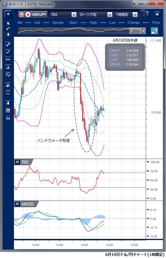 6月19日のドル/円相場は、東京時間ではトランプ米大統領が、中国の報復関税への対抗措置として、2,000億ドル規模の中国製品に10%の追加関税を課す考えを明らかにしたことが伝わりドル売りの流れとなりました。 東京朝方は110円台半ばで始まったものの、この報道をきっかけにドルは大きく売り込まれ、午後には一時109円56銭の安値まで下落しました。 この下落では、ボリンジャーバンドの下抜けと強いバンドウィークが発生していることが確認できます。 しかし、欧州時間に入ると、一段のドル売りにつながる新規材料はなく、ポジション調整のドル買戻しが先行し、110円を回復する動きとなりました。 NY時間に入ると、米中貿易摩擦激化への警戒感が残る中、NYダウが前日比で420ドル近く下落する場面があり、リスクオフからの円買いにより再び109円台に押し戻され109円71銭を付けました。 その後は明確な方向感がない中、引けにかけてのショートカバーで110円を回復しています。 RSIを見ると、NY引けでは価格は戻りきっていないなか、東京朝方の水準を大きく超えて上昇しており、やや上値の詰まっている印象があります。 ※チャートは、ドル/円の1時間足ボリンジャーバンドRSIMACDを表示しています。