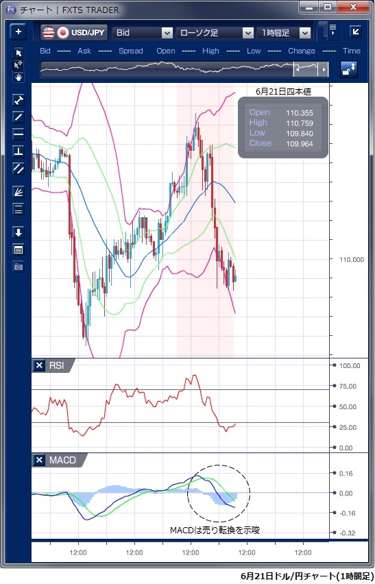 6月21日のドル/円相場は、東京時間はドルが堅調に推移しました。 日本株が上昇したことや米10年債利回りが2.9%半ばまで上昇したことを材料に、一時110円76銭の高値を付けています。 この間、相場はボリンジャーバンドの上方バンドに絡んだ動きとなっているものの、明確なバンドの拡大にはつながらず、はっきりとしたバンドウォークにはなりませんでした。 欧州時間に入ると利食いのドル売りが先行しましたが、大きな下押しにはつながらず、NYスタートでは110円60銭水準を回復しています。 その後発表された米フィラデルフィア地区連銀の6月連銀業況指数が19.9と、前月の34.4から大幅に低下し、約1年半ぶりの低水準となりました。 これを受けドルは反落、109円85銭まで急落する動きとなりました。 もっとも、MACDを見ると欧州時間の反落時にはすでに売り転換しており、その後の下落を示唆していたことがわかります。 ドル/円は先週に引き続き111円台を前に跳ね返されており、やや上値の重さを感じさせる動きとなっています。 本日も110円を挟んで明確な方向感のない動きが続きそうです。 ※チャートは、ドル/円の1時間足ボリンジャーバンドRSIMACDを表示しています。