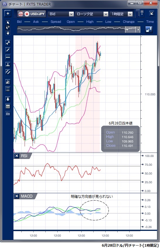 6月28日のドル/円相場は、東京時間では午前に109円67銭まで下落し、110円を割る局面があったものの、その後は110円台前半での方向感のない取引が続きました。 欧州時間に入っても同様の動きが続き、値幅も20銭程度の動意の薄い取引となりました。 NY序盤には、第1・四半期の米国内総生産(GDP)確報値が、個人消費が約5年ぶりの弱い伸びとなり、年率換算で前期比2.0%増と下方改定されたことが発表されると、ドルは軟化し、一時110円06銭の安値を付けました。 しかし、その後は米中の貿易摩擦懸念を強める目立った材料も一服していたことからドルの買い戻しが優勢となり110円65銭まで戻し、110円半ばでNYを引けています。 昨日は総じて110円台でドルが底堅い動きになったとはいえ、テクニカルで見るとMACDとシグナルが同水準で交錯しており、明確な方向性が見られません。 また、先週からのドルの戻り高値も切り下がってきており、現状では111円を超えていくイメージが湧かない相場といえます。 本日は月末で、仲値までは輸入企業のドル買いが先行し、仲値後は輸出の売りが広がる可能性が指摘されていますが、目先は109円から111円のレンジをどちらに抜けるのも難しいと思われ、新たな材料を期待したいところです。 ※チャートは、ドル/円の1時間足ボリンジャーバンドRSIMACDを表示しています。