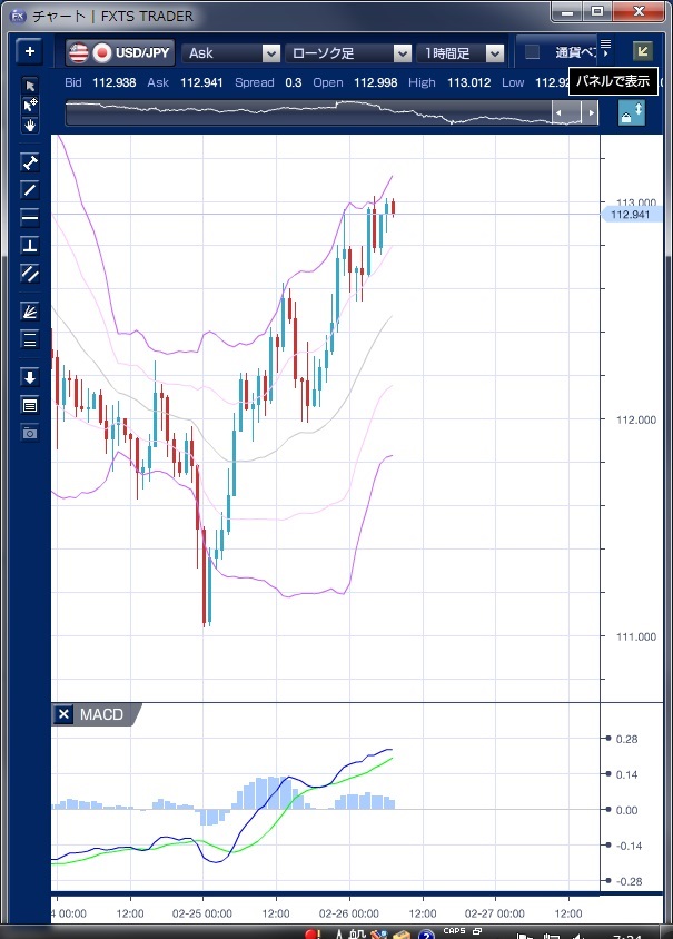 チャートは、ドル/円の1時間足ボリンジャーバンドMACDを表示しています。 昨日のドル/円相場は、前日のNY市場終盤でショートカバーが優勢となった流れを引き継ぎ、朝方の安値111円90銭から、一時112円63銭まで買い戻されました。 堅調な日経平均がドル買い戻しのサポートとなったことや、五・十日で、月末のスポット応当日にも当たるため午前中に本邦実需筋によるドル買いも見られたと指摘されます。 この上昇でボリンジャーバンドのアッパーバンドにタッチしますが、ここではバンドが上値抵抗として機能して、その後の利食いによるドル反落の引き金となった様に見えます。 欧州時間に入り、利食いに押され112円を割り込む局面もありましたが、再びドルは上昇基調に戻っています。 MACDを見ると、シグナルと交錯し売り転換しかけましたがだましに終わり、ドル買い基調が続いていることがわかります。 NY時間に入ると、米国の1月耐久財受注が予想を上回り3か月ぶりのプラスに改善したこと、ロシアのノバク・エネルギー相が、「石油輸出国機構(OPEC)の加盟国と非加盟国の石油担当相が3月中旬に会合を計画している」と発言したことを受けて原油価格が上昇に転じたことなどから、リスク選好の円売り、ドル買いが再燃し、一時113円02銭まで上昇し、112円90銭レベルでNYを引けています。