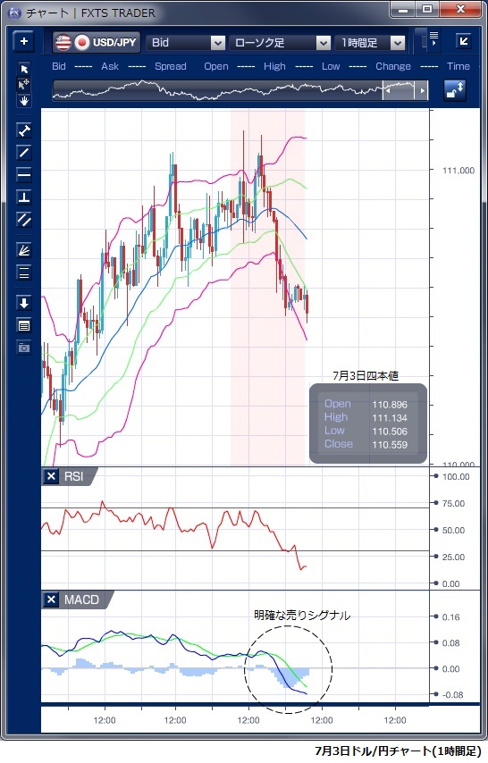 7月3日のドル/円相場は、東京午前にドル買いが優勢となり、一時111円14銭と5月22日以来1カ月半ぶり高値を更新しました。 しかし、その後にアジアの株式市場が軟調な動きとなるとドルも反落し、110円後半で方向感のない取引に戻りました。 欧州勢が参入してくる時間に再びドルは高値を試し111円台を回復したものの、111円12銭までで午前の高値を更新できませんでした。 二度の111円台への上昇では、ともにボリンジャーバンドを上抜けましたが、バンドの拡大は伴わずバンドウォークの形成には至りませんでした。 その後、米国の独立記念日での休日を控えポジション調整が優勢となりドルは反落する動きとなり、NY時間では110円51銭の安値まで下落しました。 中国人民銀行の総裁が外為市場の最近の変動を注視しているとし、人民元を安定的かつ妥当とされる水準に維持することを目指すと発言したことを受け、対ドルでの人民元安が一服し、これが新興国通貨全般の買いやドル/円での円買い・ドル売りに波及したとの指摘もあります。 テクニカルで見ると、東京から欧州序盤まではMACDとシグナルが同じ水準で交錯しており方向性がないことを示していましたが、欧州中盤に明確な売りサインに転じており、その後のドル下落を示唆するものとなっています。 本日は米国が独立記念日で休みとなることから、東京時間は模様眺めムードが強くなる可能性が指摘されています。 ※チャートは、ドル/円の1時間足ボリンジャーバンドRSIMACDを表示しています。