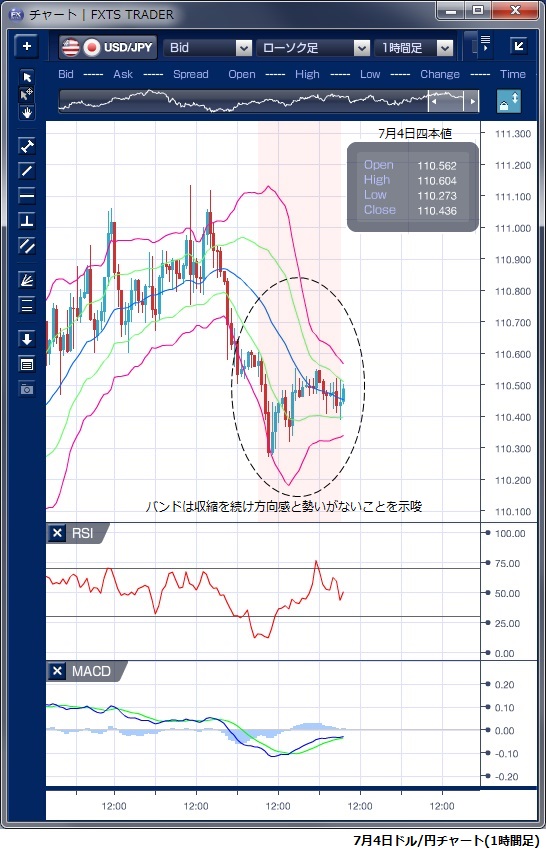 7月4日のドル/円相場は、米国が独立記念日の休日で、金融市場が休場だったことから全般に取引は閑散で110円半ばを中心とした小動きに終始しました。 東京朝方に110円27銭まで下押したものの、その後は110円40銭を中心とした非常に狭い値幅での取引が続きました。 テクニカルで見ても、ボリンジャーバンドが収縮を続けており、方向感も勢いもないことが示されています。 今週末には米雇用統計が控えており、それまでは様子見の動きが続く可能性が高いようです。 ※チャートは、ドル/円の1時間足ボリンジャーバンドRSIMACDを表示しています。