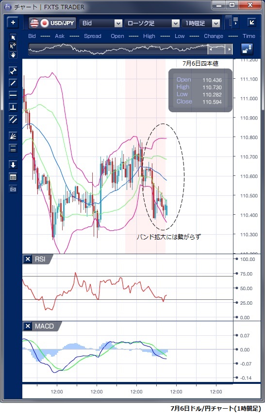先週末(7月9日)のドル/円相場は、東京から欧州時間にかけては、米国の雇用統計待ちで取引が手控えられ110円後半での小動きが続きました。 東京時間昼に米国が中国の知的財産権侵害に対抗する制裁関税を予定通りに発動したものの、市場への影響はほとんどありませんでした。 テクニカルで見ると、欧州時間にボリンジャーバンドの上下にタッチする局面があったものの、バンドの拡大はみられず、相場にエネルギーがないことが示唆されていました。 注目の米雇用統計では、非農業雇用者数が前月比21万3千人増と予想を大幅に上振れたことでいったんドル買いが強まったものの、失業率が予想外に4.0%へと上昇したほか、平均時給が前月比0.2%の上昇にとどまり、市場予想の0.3%上昇に届かなかったことから次第にドル売りが優勢となり110円38銭まで下押ししました。 米雇用統計を受けても110円台を外れることができず、方向感のない動きが続いています。 貿易・通商問題を巡る米中の対立は続いており、さらに深まる可能性があるためドルの上値も重いものの、米連邦準備制度理事会(FRB)は利上げ継続の方針を堅持しておりドルを売り込み材料もありません。 今週も、もみあいが続く可能性が高いように思われます。 ※チャートは、ドル/円の1時間足ボリンジャーバンドRSIMACDを表示しています。