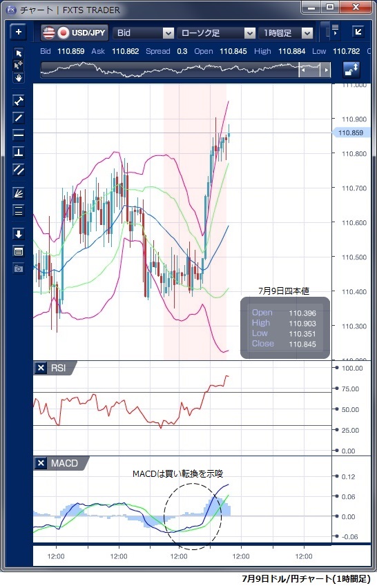 7月9日のドル/円相場は、東京から欧州時間にかけては、110円半ば水準での方向感のない動きが続きました。 週明けのアジア各国の株式市場が堅調な動きとなったことでリスク・オンの流れとなり、ドルと円がともに売られる展開となったため、ドル/円は膠着した動きとなりました。 ただし、テクニカルで見ると東京午前中にはMACDが買い転換していることから、その後のドル上昇を示唆する形となっていることがわかります。 NY時間に入ると、英ポンドに対してドルが上昇し、円に対してもドル買いが波及する形でドル/円は110円後半まで上昇しました。 英国で欧州連合(EU)離脱交渉を巡って、前日のデービスEU離脱担当相に続き、ジョンソン外相が辞任したことで英ポンド売りが強まりました。 EU離脱案を巡りメイ首相が目指す柔軟路線に反対して強硬派2閣僚が相次ぐ辞任したことにより、ブレグジットへの混迷が一段と深まったことが嫌気されたと指摘されます。 このドル上昇の流れで、ボリンジャーバンドを上抜け、バンドウォークを形成しながら110円90銭の高値を付けました。 昨日はNYダウが300ドルを超える上げ幅で引けたことで、本日も日経平均が上昇する可能性は高く、ドルも底堅い動きが続きそうです。 ※チャートは、ドル/円の1時間足ボリンジャーバンドRSIMACDを表示しています。