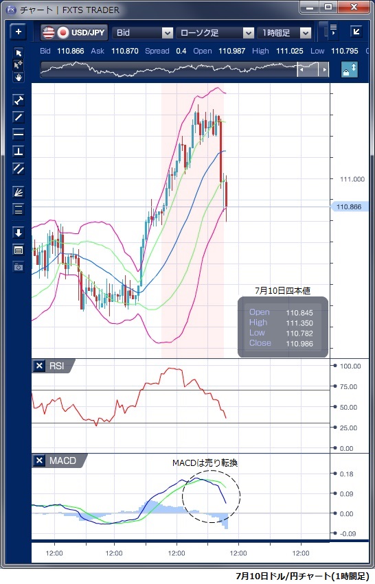 7月10日のドル/円相場は、110円後半で東京が始まったのち、堅調な株式市場や本邦輸入企業のドル買いに支えられながら111円台を回復しました。 海外時間でも各国の株式市場は堅調でドル買いの流れは続き、NY序盤には一時111円35銭と5月下旬以来、約1カ月半ぶりの高値を付けました。 しかし、その後は伸び悩み111円前半の水準での揉み合いとなり、この揉み合いでMACDは売り転換しドルの上値の重いことを示唆する形となっています。 NY終了間際に米ブルームバーグが、トランプ大統領が追加関税の対象となる2000億ドル相当の中国製品のリストを準備しており、今週中には公表するなどと報じ、これを受けて米中貿易摩擦への不透明感からドル売りが優勢となって、一気に111円を割り込む動きとなりました。 このドルの急落で、ボリンジャーバンドは下抜けましたが、バンドの拡大は見られず、ドルの下落が加速する勢いがないことが示されています。 米中貿易摩擦への懸念がドルの上値を抑えた形で、短期的には昨日の高値111円30銭水準が天井圏を形成する可能性もありそうです。 ※チャートは、ドル/円の1時間足ボリンジャーバンドRSIMACDを表示しています。