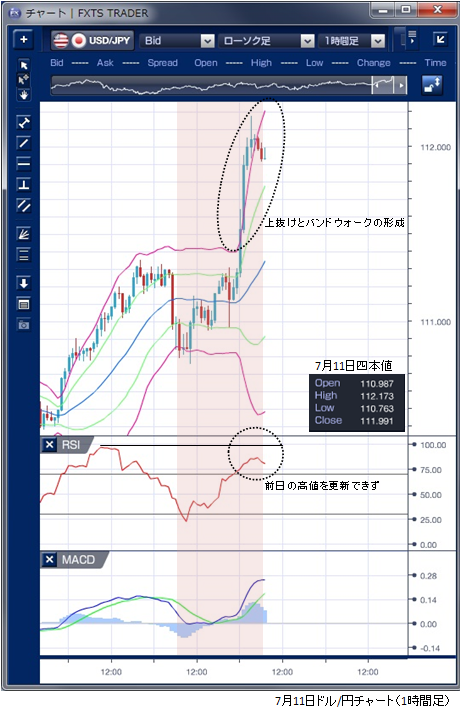 7月11日のドル/円相場は、NY時間終盤にトランプ米政権が追加で2000億ドル相当の中国製品に10%の関税を適用する方針を明らかにしたことを受けたドル安の流れを引き継ぎ、110円後半での取引で始まりましたが、急速な円買いが一巡すると午前10時過ぎからドルはじりじりと反発し、111円台を回復する動きとなりました。 その後はNY時間まで、111円前半で方向感のない動きが続きました。 NY時間に入ると、序盤に発表された6月の米卸売物価指数(PPI)が前月比0.3%上昇、前年比では3.4%上昇と、2011年11月以来の大幅な伸びとなり、これを受けて利上げペースが加速するとの思惑にドル買いが優勢となり、一気に112円台を回復、一時112円17銭と1月中旬以来ほぼ半年ぶりのドル高水準まで上昇しました。 この上昇では、ボリンジャーバンドの上抜けと、明確なバンドウォークの形成が確認できます。 ただし、価格の高値更新にかかわらず、RSIは前日の高値を更新することができておらず、やや上値が詰まってきている印象となっています。 米中間の貿易を巡る緊張が高まっているほか、米金利が低下し株価が下落する中で特段の手がかりがないままドル買いが続いていることに違和感を持つ市場参加者もあり、久々の高値圏で戻り売りがどの程度強まるかを確認したいという指摘もあります。 ※チャートは、ドル/円の1時間足ボリンジャーバンドRSIMACDを表示しています。