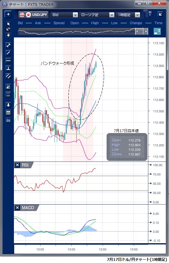 7月17日のドル/円相場は、東京から欧州時間にかけてパウエル米連邦準備理事会(FRB)議長の議会証言待ちとなり、朝方から午後3時 までの値幅は上下33銭程度にとどまりました。 テクニカルで見ても、ボリンジャーバンドの上下に達する場面もありましたが、ともにバンド拡大にはつながらず一過性の動きにとどまっていました。 注目のパウエルFRB議長の議会証言では、「減税や歳出拡大が米経済の成長を支え続けるだろう」と楽観し、金融政策は「米経済の拡大が続き、段階的な利上げの継続が最善だ」との見方を示しました。 この発言を受けて、市場は素直にドル買いに反応し、112円半ばを抜けて上昇、ボリンジャーバンドを上抜けバンドウォークを形成しながら上昇し、一時112円93銭の高値を付ける動きとなりました。 その後の高値圏を維持しNYを引けましたが、東京早朝には112円94銭を付け、NY時間の高値を上回ってきています。 本日もドルの高値を試す動きが予想され、113円台を回復できれば年初来高値の113円39銭が視野に入ってくるとの指摘もあります。 ※チャートは、ドル/円の1時間足ボリンジャーバンドRSIMACDを表示しています。