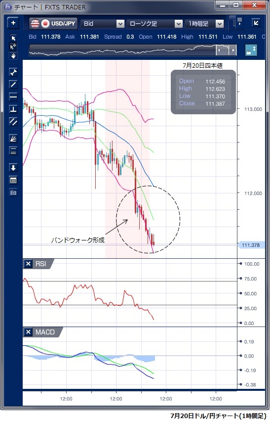 先週末(7月20日)のドル/円相場は、アジア時間は人民元安やアジア株安を受けてリスク回避傾向が強まり、112円前半で軟調な動きとなりました。 前日のトランプ大統領の発言での下押しからやや反発していたものの、上値の重い動きが続きました。 海外時間に入っても112円前半での小動きが続きましたが、NY序盤にトランプ米大統領がドル高をけん制する発言をツイッターに投稿したことを受けドルは急落しました。 トランプ米大統領は、「中国、欧州連合(EU)やほかの国々は通貨を操作し、金利を抑えている」とドル高に異を唱え、さらに米連邦準備理事会(FRB)の利上げ継続方針に対しても「いま金融政策を引き締めると、我々がやってきたことを全て損なう」と投稿しています。 この流れで、ボリンジャーバンドを下抜け、バンドウォークを形成しながら111円37銭まで下落しました。 トランプ大統領のドル高をけん制する発言でドルは高値から2円程度反落しており、ドル上昇基調が一服する可能性が強まっています。 ただし、直接的な為替操作や利上げ阻止は考えにくく、市場の警戒感がどこまで高まるのかを見極める必要がありそうです。 ※チャートは、ドル/円の1時間足ボリンジャーバンドRSIMACDを表示しています。