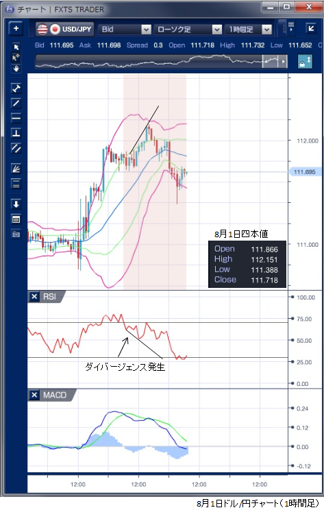 8月1日のドル/円相場は、東京から欧州序盤にかけてはドルが底堅い動きを続け、一時112円15銭の高値を付けました。 ただし、高値を更新したものの、RSIは切り下がっており上値が詰まってきている印象を受ける形となっています。 また、MACDを見ると欧州時間のドル上昇で買い転換しかけたものの騙しに終わっており、その後のドル下落の可能性を示唆するものとなっています。 NY時間に入ると米国の7月ADP雇用統計が予想を上回ったことを好感してドルが上がる局面があったものの、米政府が中国からの輸入品2000億ドル相当に対する関税の税率を従来案の10%から25%に引き上げることを検討していると伝わったことから、米中貿易戦争への懸念が再燃し、ドルは反落し一時111円39銭の安値を付けました。 その後、NY引けにかけては、ドルの買い戻しも出て111円70銭水準で引けています。 NY時間のドル下落では、ボリンジャーバンドを大きく下抜けたものの、明確なバンドウォークにはつながっておらず、ドル下落の勢いが限られたものであることが示唆されています。 本日は111円台で方向感のない動きが続きそうです。 昨日は米10年債利回りが3%を再び超えたこともあり、ドルの下値は堅いものの、米中貿易摩擦への懸念がドルの上値を抑えています。 また、明日には米国の雇用統計を控えていることもあり、様子見ムードが強まることも考えられます。 ※チャートは、ドル/円の1時間足ボリンジャーバンドRSIMACDを表示しています。