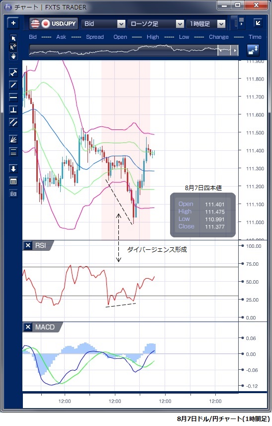 8月7日のドル/円相場は、東京時間では目立った材料がなく、動意に乏しい時間帯が続き111円前半での小動きが続きました。 欧州時間に入ると、特に材料のないなかポジション調整のドル売りが優勢となり、一時110円99銭と111円を割る場面がありました。 この下落では、ボリンジャーバンドの下抜けと軽いバンドウォークの発生が確認できます。 ただし、この下落で価格は安値を更新したものの、RSIは切り上げってきており、その後のドル反発を期待させる形となっています。 NY時間に入ると、米国の6月JOLT求人件数が予想を上回ったことや、3年物米国債入札の低調な結果などを受けて米国債全般が売られ10年物米国債利回りが上昇したことなどを材料にドルの買い戻しが優勢となって111円半ばを回復してNYを引けています。 日銀決定会合、米連邦公開市場委員会(FOMC)、米雇用統計など重要イベントを先週通過したこともあり、マーケットは夏休みモードに入りつつあるとの指摘もあり、今週は明確な方向感が出ることは期待しにくいかもしれません。 ※チャートは、ドル/円の1時間足ボリンジャーバンドRSIMACDを表示しています。