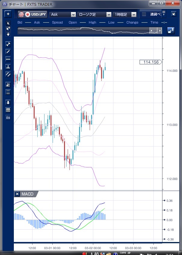 チャートは、ドル/円の1時間足ボリンジャーバンドMACDを表示しています。 昨日のドル/円相場は、NY引け後に112円前半へと下落した流れを受け上値が重く始まりました。 その後、中国国家統計局が発表した2月の中国製造業購買担当者景気指数(PMI)が予想を下回ったことで112円16銭まで下落したものの、この水準では下げ渋り、日経平均株価がプラス圏に浮上すると、午後にかけてじり高となりました。 MACDも東京午後には買い転換しており、午後のドル上昇をサポートする形となっていました。 欧州時間に入ってもドルは堅調な足取りで113円台を回復する動きとなりました。 NY時間に入ると、米国の2月ISM製造業景況指数や1月建設支出が予想を上回ったため、年内の追加利上げ観測を受けたドル買いが再燃し、2月18日以来の高値となる114円19銭を付け、ほぼ高値圏で引けています。 この上昇の流れで、ボリンジャーバンドを上抜けバンドウォークが発生していることが確認できます。 115円を回復できれば、日足ベースで見たダブルボトム完成となるため、ドルの底打ちが期待できますが、週末に米雇用統計を控えていることもあり、目先は慎重な動きが続きそうです。
