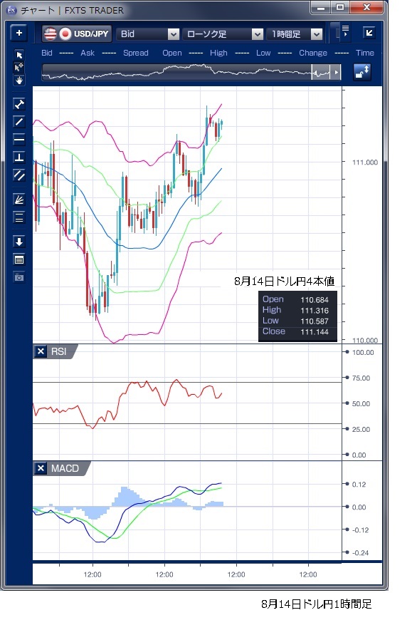 8月14日のドル/円相場は、東京時間は前日の流れを引き継ぎドルが強含んだものの111円を突破できず110円後半での小動きに終始しました。しかし、欧州勢が参入してくるとドル買いが優勢となり111円を抜け111円15銭の高値を付けました。 この上昇でボリンジャーバンドを上抜けましたが、バンドの拡大は伴わず、上値抵抗となってしまい、その後に110円76銭まで反落しています。 NY中盤になると、前日まで急落していたトルコリラへの売りが一服し、投資家がリスクを回避する姿勢を緩め、米株式相場も上昇したこともありドルの買い戻しが強まり111円32銭の高値を付けました。 もっとも、価格では高値を更新したものの、RSIは高値更新ができず、上値の詰まった印象のチャートとなっています。 また、この上昇でもボリンジャーバンドの上抜けがバンドウォークにつながっていないことからドルの上昇力はあまり強くないことが示唆されています。 ドル/円は111円台を回復してきており、110円割れのリスクは遠のいたものの、111円半ばからはドル売りが厚いと指摘され、一段の上昇は難しいかもしれません。 ※チャートは、ドル/円の一時間足ボリンジャーバンドRSIを表示しています。