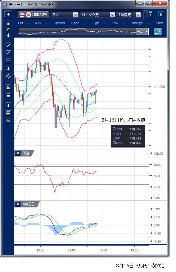 8月16日のドル/円相場は、東京時間朝方に前日の海外市場の安値を再度試しに行き110円45銭の安値を付けました。しかし、その後はドルの買い戻しが優勢となり110円後半へ反発、欧州時間も110円後半での取引が続きました。この間、MACDが買い転換しており、その後のドル上昇を示唆する形となっています。 NY時間に入ると、序盤に発表された8月のフィラデルフィア連銀製造業景況指数は21カ月ぶりの低水準となり、7月の住宅着工件数も市場予想を大幅に下回ったことからドルは110円56銭まで値を下げました。 その後、米国と中国が貿易協議を再開すると伝わり、米中貿易摩擦への懸念が後退し、米株式相場が大幅に上昇したことを受けドルも反発、さらにトランプ大統領やクドロー米国家経済会議(NEC)委員長がドル高を評価する発言をしたこともあり111円12銭まで上昇しました。ただし、引けにかけてはムニューシン米財務長官が、トルコ当局が拘束している米国人牧師を解放しなければ、追加制裁を科す用意があると語ったことを受けドルは上げ渋り110円90銭水準で引けています。 ドル/円は110円半ばから下値が堅くなる一方、111円台では上値が重く、本日も110円後半での小動きが続くことが予想されます。 ※チャートは、ドル/円の一時間足ボリンジャーバンドRSIを表示しています。