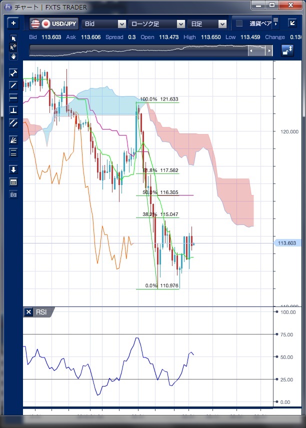チャートは、ドル/円の日足一目均衡表RSIを表示しています。 昨日のドル/円相場は、日・欧の株式の上昇に合わせて114円前半まで値を戻す局面はあったものの、NY時間には反落し113円台に押し戻される動きとなりました。 NY時間の朝方発表された2月の米ADP民間雇用者数が予想を上回る増加となりましたが、米国と海外の金融政策の違いが継続するかについて懐疑的な見方もあり、原油価格が経済や金融政策に及ぼす影響も懸念されることもあり、4日発表の米雇用統計を控えて利益確定のドル売りが上値を抑えたとの指摘もあります。 NY後半では113円23銭まで売り込まれ、ほぼ安値圏での引けとなっています。 テクニカルで見ると、明確なバイアスが見られず、次の方向性を探る動きといえます。 RSIは中立水準まで押し下げられ、このまま上昇するかどうかは判断しにくいところです。 現状は、2月のダブルボトムの底である111円水準が下値めどとなり、今年の下落幅の38.2%戻しでありダブルボトムのネックラインである115円水準が上値のめどとなり、どちらに抜けるのかを見極める必要があるでしょう。