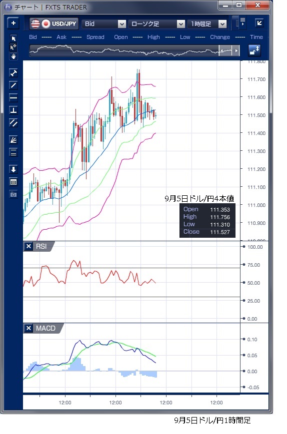 9月5日のドル/円相場は、東京時間では前日の海外時間にドルが買われた流れを引き継ぎ一時111円71銭と8月30日以来、約1週間ぶり高値を更新しました。この上昇でボリンジャーバンドが上抜けたものの、ヒゲだけの上抜けに終わり、バンドの拡大もなくバンドウォークにはつながりませんでした。また、価格は前日高値を更新したものの、RSIは切り下がっており、111円台後半の重さを感じさせる形状となっています。 その後、欧州参入後は111円半ばまで押し戻され、MACDの売り転換が確認できます。 NY時間に入ると、米ブルームバーグが、英国のEU離脱交渉で「英とドイツが離脱の主要な要求を取り下げた」と報じたことから、交渉が進みやすくなるとの見方が浮上し、ユーロや英ポンドが主要通貨に対して買われる動きとなり、ユーロ/円や英ポンド/円も上昇、これにつられる形でドル/円も上昇し、111円76銭の高値を付けました。 ただし、再開された米国とカナダの北米自由貿易協定(NAFTA)の再交渉が難航しているようで、貿易摩擦の不透明感が意識され、ドル/円の上値も重くなり111円半ばに押し戻されてNYを引けています。 ドル/円はじりじりと111円後半まで値を戻してきたものの、112円手前でのドル売り意欲は強く、テクニカルで見てもややドル/円の上値が詰まってきているように見え、また明日に米雇用統計の発表を控えていることもあり、本日は111円台での足踏みとなる可能性が高いように思われます。 ※チャートは、ドル/円の1時間足ボリンジャーバンドRSIMACDを表示しています。