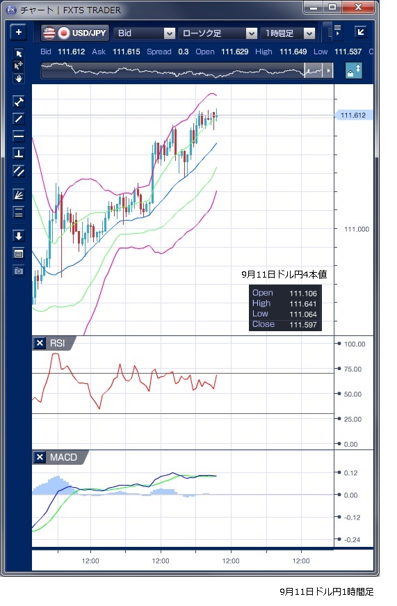 9月11日ドル/円相場は、東京朝方111円水準でスタートした後、仲値にかけて実需の買いに支えられ111円半ばまで上昇しました。また、半導体大手のルネサスエレクトロニクスが米半導体メーカーのインテグレーテッド・デバイス・テクノロジーの買収を決議したとの発表もドル高につながったとの指摘もあります。 この上昇で、ボリンジャーバンドを上抜け、小さなバンドウォークを形成したものの、RSIは横ばいであり、明確なトレンドにはつながらず、緩やかな上昇にとどまりました。 欧州時間では、ややドル売りが優勢となる局面があったものの、NY時間に入ると米8月NFIB中小企業楽観指数や7月JOLT求人件数がそれぞれ過去最高を記録、米国経済の成長期待が一段と強まったことで米長期金利が一時2.98%と8月上旬以来の水準に上昇し、ドル円も111円64銭の高値を付けました。 もっとも、ボリンジャーバンドのバンド幅の明確な拡大もなく、MACDとシグナルも交錯しており、上昇の流れに勢いは感じられません。111円台半ばから後半ではドル売り意欲が根強いとの指摘もあり、112円を試しきれない場合には調整的なドル反落には注意が必要でしょう。 ※チャートは、ドル/円の1時間足ボリンジャーバンドRSIMACDを表示しています。