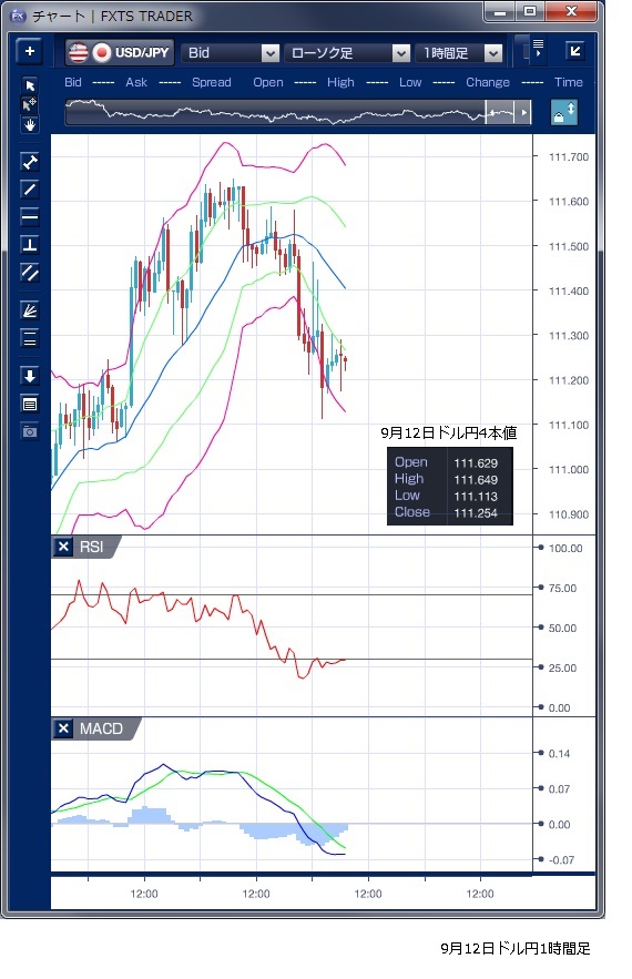 9月12日のドル/円相場は、東京時間では前日海外市場で全般に円が売られた流れを引き継ぎ、111円半ばでのスタートとなったものの、徐々にドルの上値が抑えられる動きとなりました。2年7カ月ぶりの安値圏まで下落している上海総合株価指数が嫌気されたとの指摘もあります。 テクニカルを見ると、東京午前にはMACDが売り転換しており、その後のドル下落を示唆する形となっていたことがわかります。 その後NY時間序盤までは111円半ばでのこう着した取引が続きましたが、8月の米生産者物価指数が1年半ぶりに前月比でマイナスとなったことを受け、米国の物価上昇への警戒感が和らぎ、米長期金利が低下、ドルも軟調な動きとなりました。その後、ムニューシン財務長官ら米政府高官らが今週、中国に対し通商交渉再開を求めたとの報道にドルが反発する局面があったもののドル売りの流れは継続し、一時111円12銭の安値を付けました。 このドル下落で、ボリンジャーバンドを下向け、バンドウォークが形成されていることが確認できます。 本日は中国株の行方が注目されるほか、トルコ中銀の金融政策決定会合を控えておりリスク・オフのムードになりやすく、市場は様子見で動きにくくなることが予想されます。 ※チャートは、ドル/円の1時間足ボリンジャーバンドRSIMACDを表示しています。