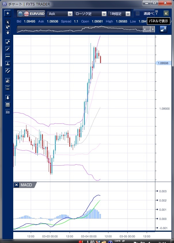チャートは、ユーロ/ドルの1時間足ボリンジャーバンドMACDを表示しています。 昨日のユーロ/ドル相場は、アジアから欧州時間にかけては1.08ドル台で方向感のない動きを続けました。 しかし、NY時間に入ると2月の米ISM非製造業総合指数は53.4と市場予想の53.2を上回ったものの 、内訳の雇用指数が49.7と前月の52.1から低下し、節目となる50を2014年2月以来、初めて割り込んだことや1月製造業受注が予想を下回ったことを受けて、年内の追加利上げ観測が後退しドル売りが強まりました。 特にユーロ/ドルでのドル売り反応は大きく、1.08ドル後半から一気に1.0973ドルまで上昇しました。 この流れでボリンジャーバンドの上抜けと、強いバンドウォークが確認されます。 もっとも、MACDを見ると東京昼には売り転換に兆しがあったものの騙しに終わっており、海外市場でのユーロ高が示唆されていました。 本日は、米国の雇用統計を控え東京時間は模様眺めムードが強まりそうですが、雇用統計後には大きな波乱の可能性もあり注意が必要でしょう。