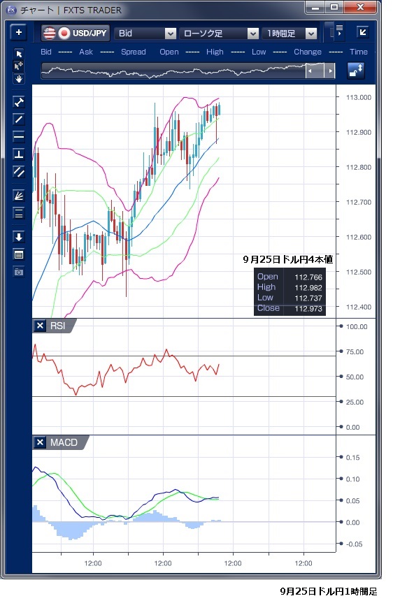 9月25日のドル/円相場は、東京朝方では連休明けの五・十日ということもあり、仲値付近に輸入企業のドル買い・円売りが膨らみ113円を試す動きとなりました。しかし、113円を突破することはできず、その後は日米通商協議(FFR)を控えて様子見ムードが強まり112円80銭〜90銭での揉み合いとなりました。 欧州時間も同様の動きを続けましたが、MACDを見ると欧州参入後に売り転換していることが確認でき、その後のドル下押しが示唆されています。実際に欧州中盤では112円74銭まで下押ししましたが、下値では押し目買い意欲も強く底堅い動きが見られました。 NY時間に入ると、序盤に米10年物国債利回りが一時3.11%とほぼ4カ月ぶりの水準に上昇したことでドル買いが優勢となり、再び113円を試す動きとなりました。 ただし、本日に米連邦準備理事会(FRB)による米連邦公開市場委員会(FOMC)の結果発表を控えていることもあり、113円抜けを買い上げる勢いはありませんでした。 今回のFOMCでは利上げされることは確実視されているものの、会合後に公表される参加者の政策金利見通しなどを見極めたいとする市場関係者が多いと指摘されています。 ※チャートはドル円の1時間足ボリンジャーバンドRSIMACDを表示しています。