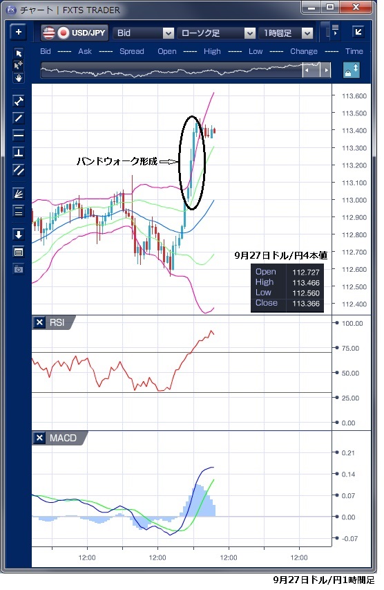 9月27日のドル/円相場は、東京朝方に113円台に迫る場面もあったものの、日経平均株価が下げ幅を広げると同時に伸び悩み、その後は112円後半での動きが続きました。欧州序盤にはドル売りが優勢となり、一時112円56銭まで下押す局面がありましたが、112円半ばからのドル買い意欲は強く、ボリンジャーバンドが下値抵抗となり下支えられています。 その後は、ドルの買い戻しが優勢となり、NY時間に入ると序盤に発表された8月の米耐久財受注額が前月比4.5%増と市場予想(2.1%増)を大幅に上回ったこともあり、ドル買いが進みました。また、米株式市場でダウ工業株30種平均が4日ぶりに反発したこともドルの支援材料となったと指摘されます。 このドル上昇では、ボリンジャーバンドの上抜けとバンドウォークの形成が見られ、一時113円47銭と年初来高値まで上昇し、昨年12月下旬以来のドル高水準を付けました。ただし、RSIを見ると一本調子に水準を上げ、既に90を上回る水準まで上昇していることから短期的な調整リスクが高まっていることにも注意が必要でしょう。 ※チャートはドル円の1時間足ボリンジャーバンドRSIMACDを表示しています。