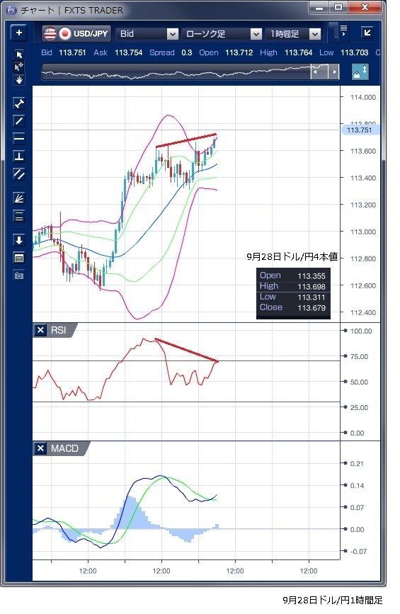 先週末(9月28日)のドル/円相場は、月末、半期末にあたり売買が交錯しました。 東京朝方の取引では113円前半で推移していましたが、仲値を経て113円65銭まで上昇しました。 欧州時間に入ると、ドル売りがやや優勢となり、113円30銭水準までの押しが入ったものの、その後NY時間では再び上値を試す動きとなりました。 NY時間では、取引終盤に113円71銭と昨年12月以来9カ月ぶりの高値を付けました。 NY朝方発表の8月の米個人消費支出(PCE)統計で、米連邦準備理事会(FRB)が利上げ判断で重視するPCEデフレーターが前年同月比プラス2.2%となり、ほぼ市場の予想通りだったものの、6カ月連続で政策目標の2%を上回ったことがドル買いに安心感を与えたとの指摘もあります。 ただし、テクニカルで見るとNY時間の価格の高値更新にもかかわらず、RSIが切り下げっていることから、やや上値の詰まったイメージとなっています。今週末には雇用統計の発表があり、市場では内容次第で115円台を探るとの見方もあるようですが、その前に一度調整が入る可能性には注意が必要でしょう。 ※チャートはドル円の1時間足ボリンジャーバンドRSIMACDを表示しています。