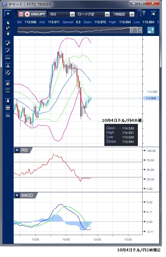 10月4日のドル/円相場は、東京朝方に昨日の海外高値を上抜き114円55銭まで上昇しました。しかし、上値では国内勢の利食いの売りに押され、さらに午後に入ると日経平均が下げ幅を拡大したことでじり安の動きとなりました。東京午前にはMACDが売り転しており、その後のドル下落を示唆する形となっています。 欧州序盤では、114円30銭を挟んだ小動きが続きましたが、NY時間に入るとドル売りが優勢となりました。10年物の米国債利回りが2011年5月以来の高水準を付け、米金利の急速な上昇への警戒感から、ダウ平均が350ドル余り下げたことが嫌気されました。 また、本日の米雇用統計を控えてポジション調整のドル売りも見られ、一時113円64銭まで下落し、113円90銭水準でNYを引けています。 NY引けにかけてドルは値を戻していますが、RSIは安値圏に張り付いており明確な反発の兆しがありません。 本日の米雇用統計を見極めるまでは、再度114円をしっかり超えていくことは難しいかもしれません。 ※チャートはドル円の1時間足ボリンジャーバンドRSIMACDを表示しています。